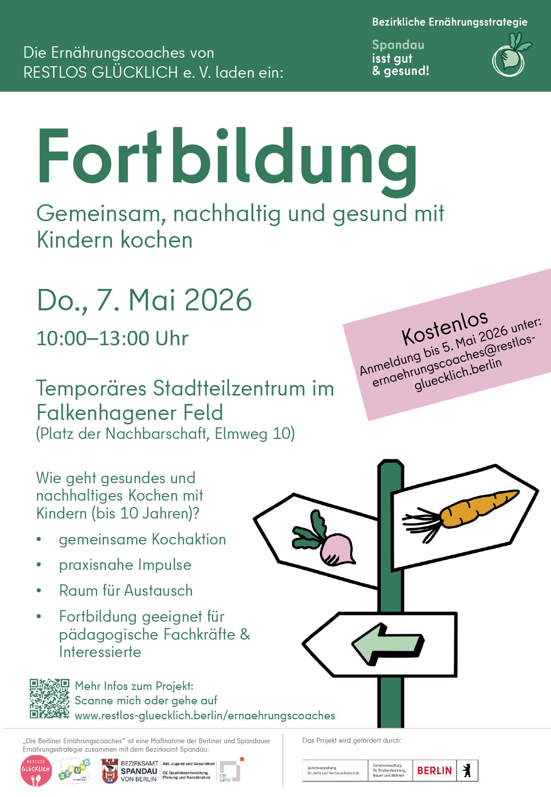 Der gemeinnützige Verein RESTLOS GLÜCKLICH e.V. lädt am 7. Mai 2025 zu einer praxisorientierten Fortbildung ein. Unter dem Titel „Gemeinsam kochen und essen – kinderleichte und alltagstaugliche Rezepte“ erwartet die Teilnehmenden von 10:00 bis 13:00 Uhr ein abwechslungsreiches Programm, das von Catrin Bechimer geleitet wird. Veranstaltungsort ist das Temporäre Stadtteilzentrum im Falkenhagener Feld, Platz der Nachbarschaft, Elmweg 10, 13589 Spandau.