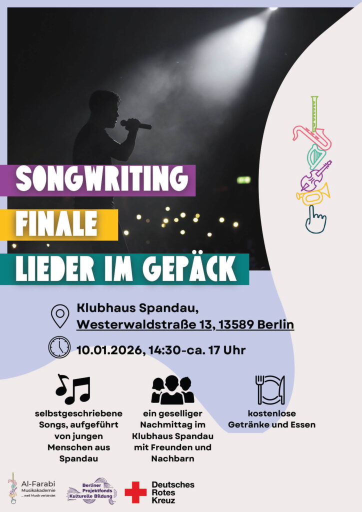 Liebe Freundinnen, Unterstützerinnen und Musikbegeisterte, wir laden euch ganz herzlich zu unserem Songwriting-Finale im Rahmen des Musikaktionstags ein! Freut euch auf einen gemeinsamen Nachmittag voller Musik, Begegnungen und kreativer Energie – mit Songs, die in Spandau entstanden sind und von jungen Menschen selbst auf die Bühne gebracht werden.