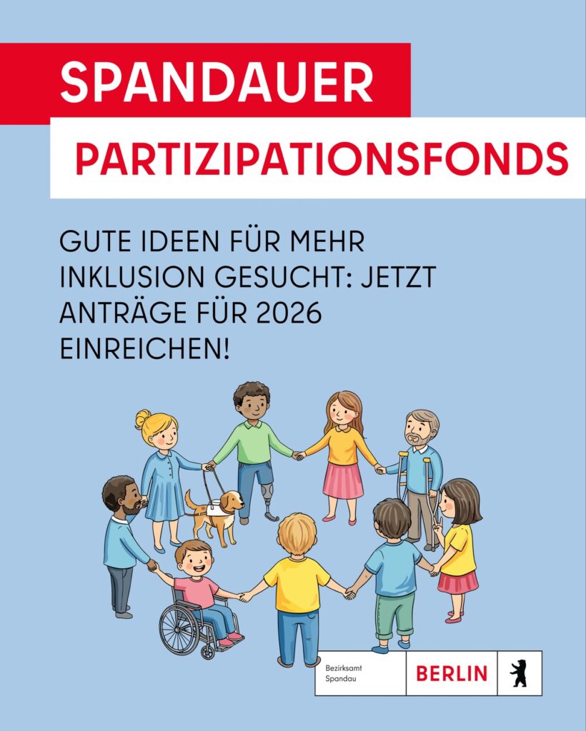 Trotz der angespannten Haushaltslage in Berlin gibt es gute Nachrichten: Der Spandauer Partizipationsfonds wird auch 2026 fortgeführt. Damit können erneut Projekte gefördert werden, die Barrieren abbauen und Inklusion in Spandau stärken.