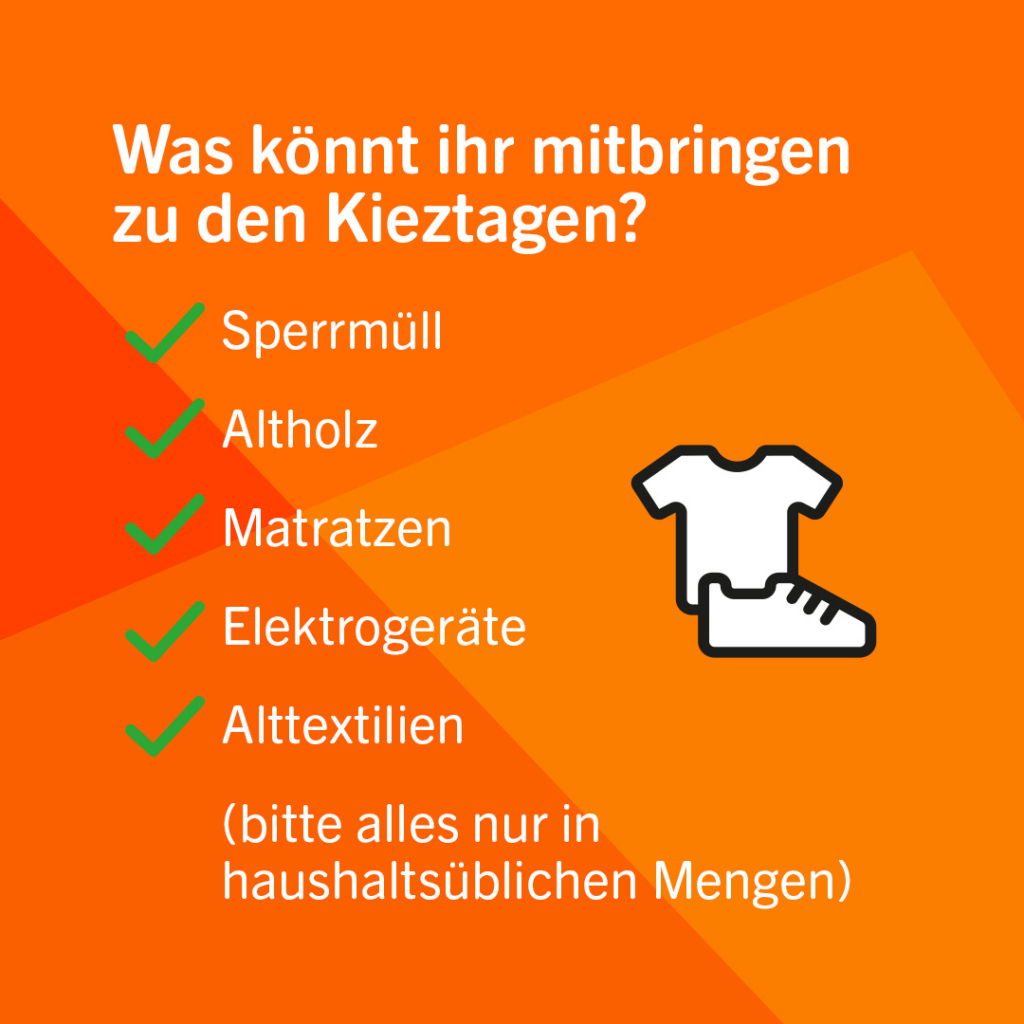 - Kommode, Hocker, Anrichte oder Teppich sind hier richtig. Elektrogeräte und Alttextilien können Sie auch gern mitbringen.