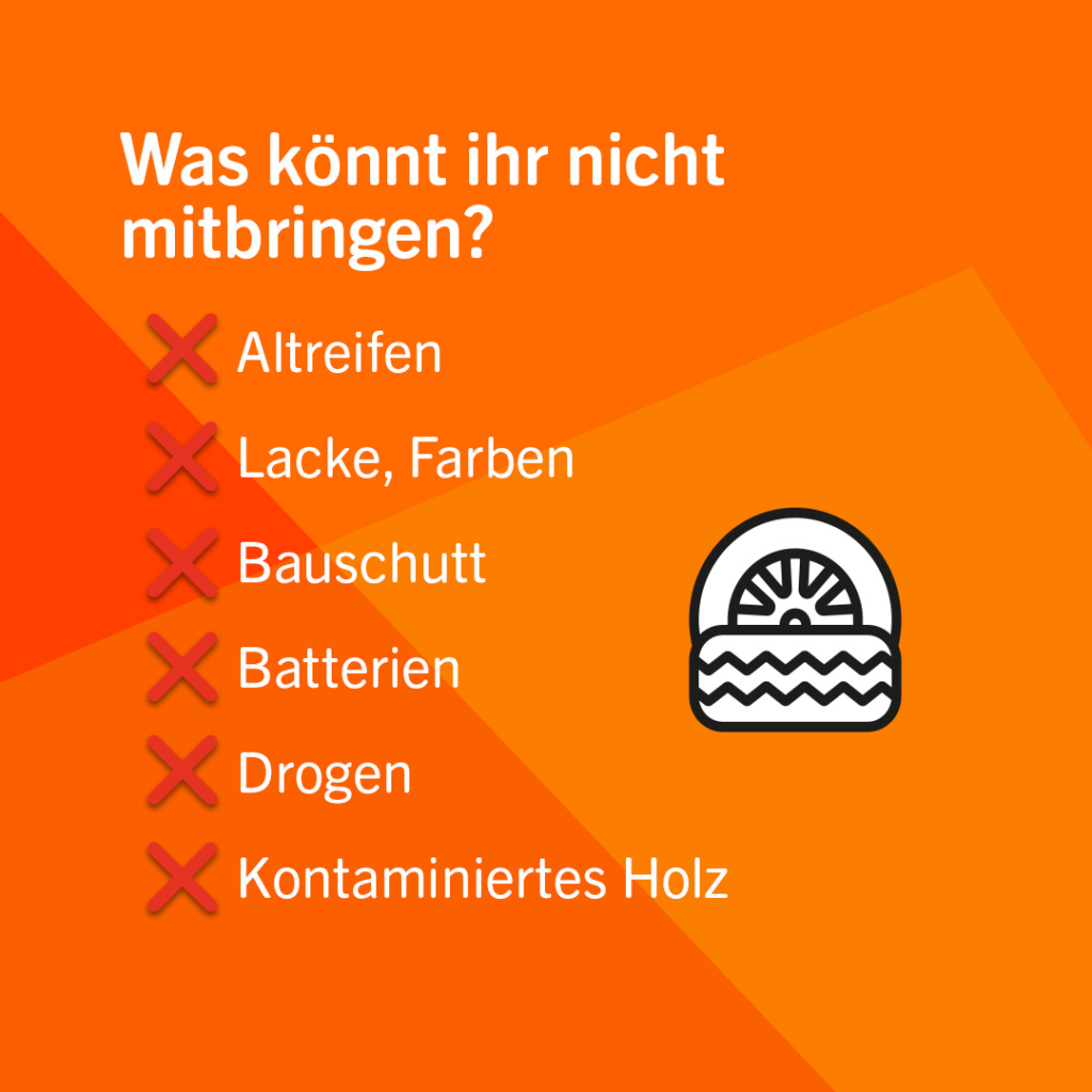 - Bitte lassen Sie Schadstoffe wie Lacke, Farben, Bauschutt, Batterien o.ä. zu Hause. Diese Dinge können wir nicht annehmen.